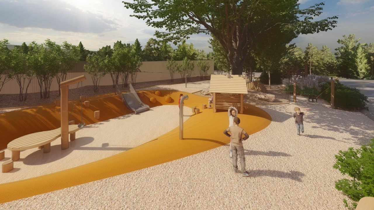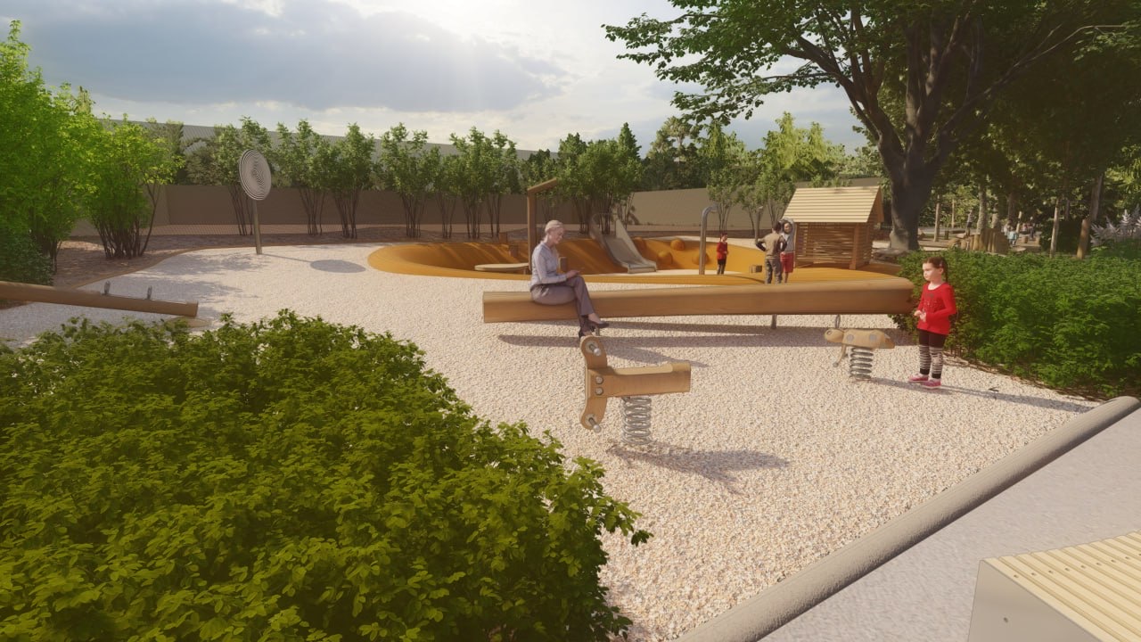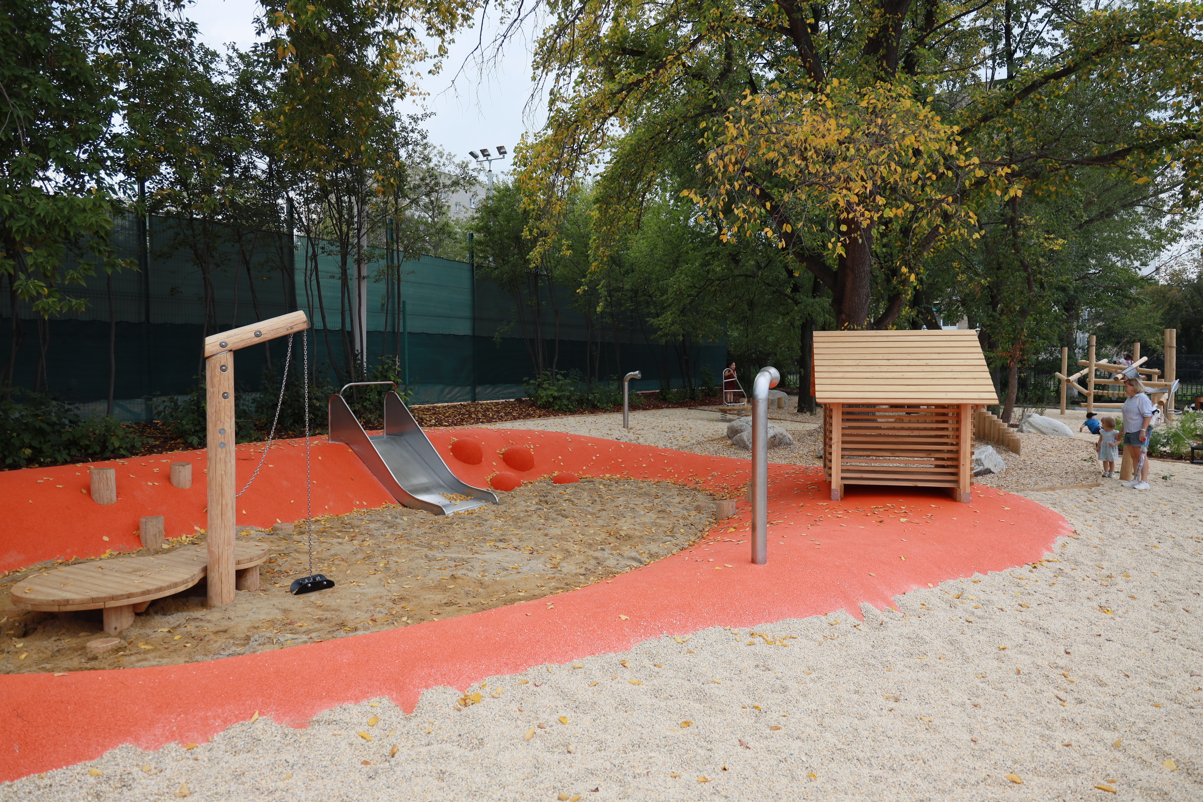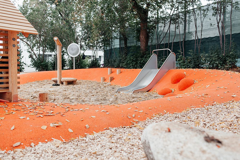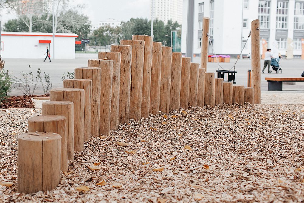 Покрытие на площадке использовали в виде естественных материалов - речной гальки и древесной щепы.