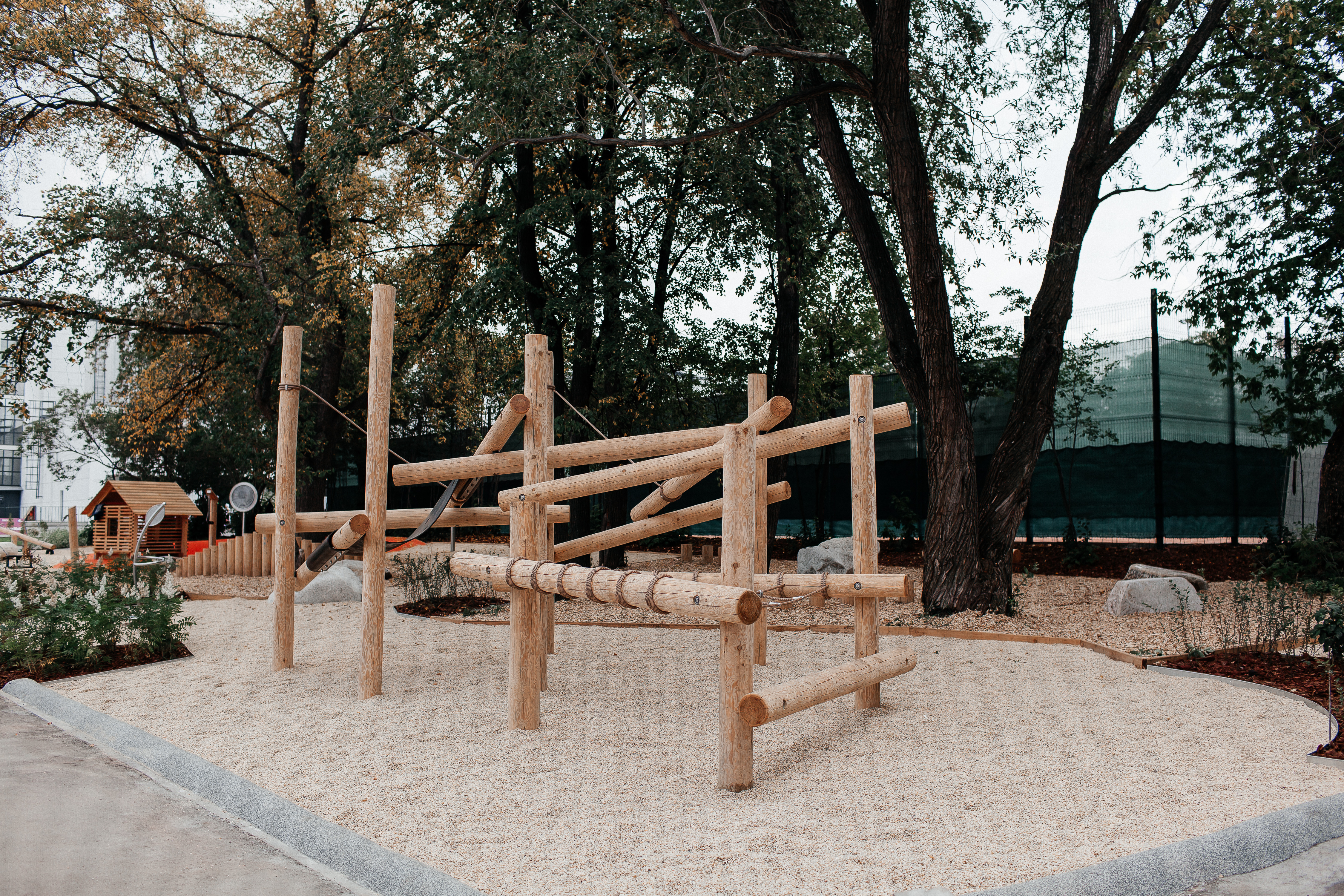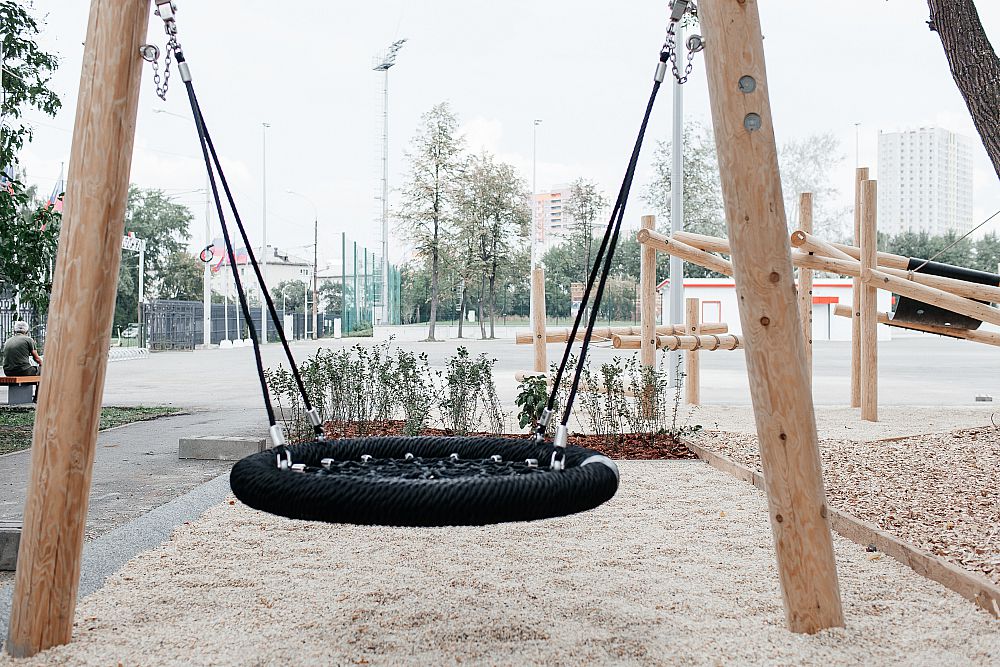 Зона для ребят школьного возраста организована в виде большого лазательного комплекса, качели-гнездо, балансировочной стены из бревен и вертушки.
