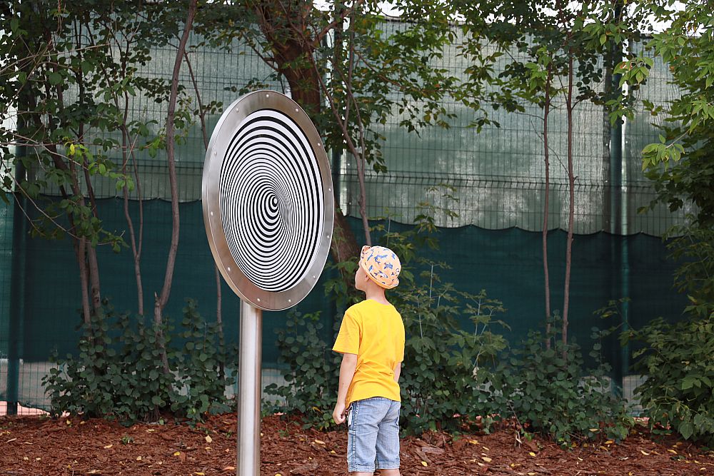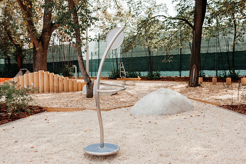 По всей зоне игрового пространства расположены камни-валуны. При первом приближении они расположены в легком беспорядке, но их расположение - достаточно выверенный архитектурный замысел. В кронах деревьев они служат продолжением балансировочной тропы, побуждая ребенка к свободной игре и проверке своих возможностей, а на открытых пространствах - местом, где смогут дополнительно разместиться родители, ожидающие детей, или местом отдыха детей от подвижных игр. В местах нового озеленения камни служат просто декоративной функцией, дополняя ландшафтную композицию.