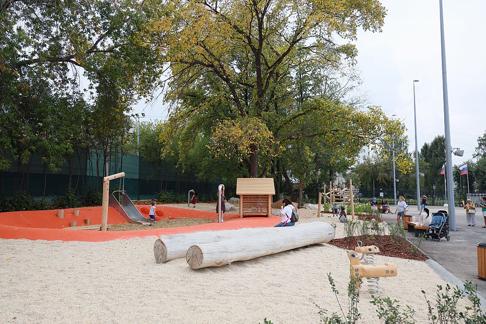 На площадке можно выделить несколько зон. Самая заметная из них это пространство песочницы, где дети дошкольного возраста могут скользить по горке, взбираться по резиновым кочкам или бревнам, пересыпать песок с помощью песочного крана, прятаться в домике. Также здесь есть качель для малышей, большая коряга и несколько качалок-пружин.