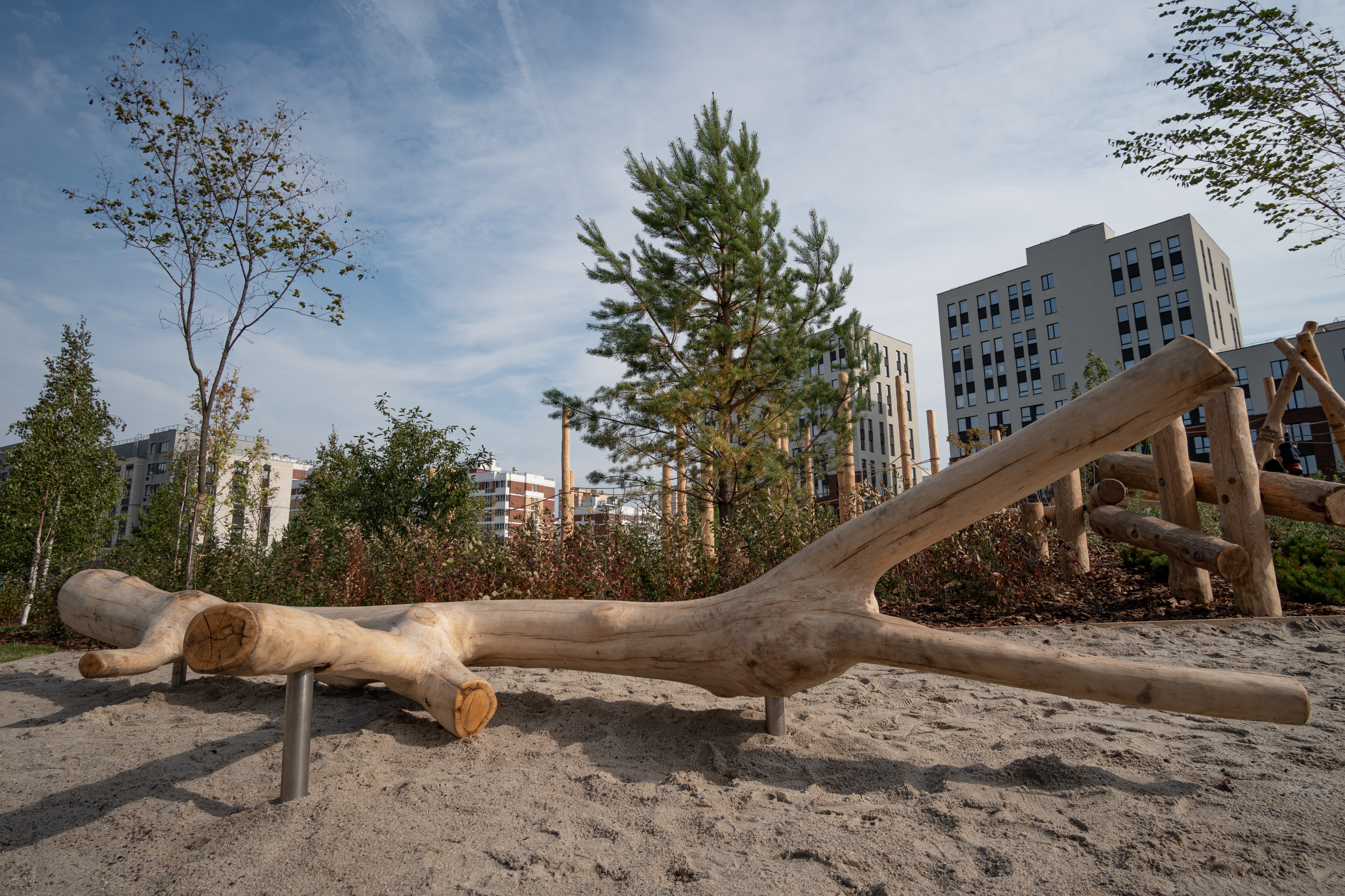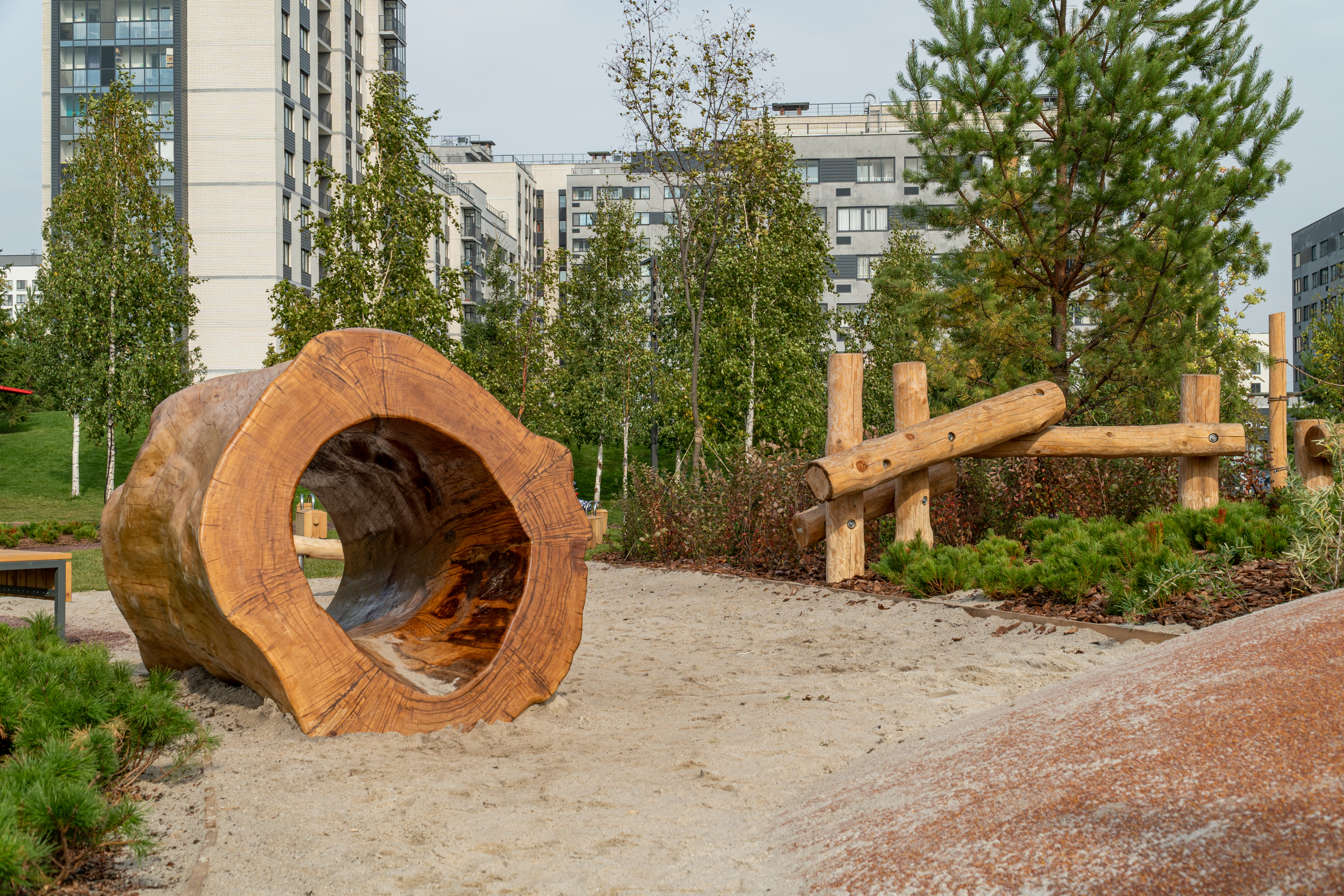 - зона для малышей (0-3 лет). Малыши могут изучать тоннель-бревно из многовекового дуба снастоящим дуплом, корягу и барашки-качалки;