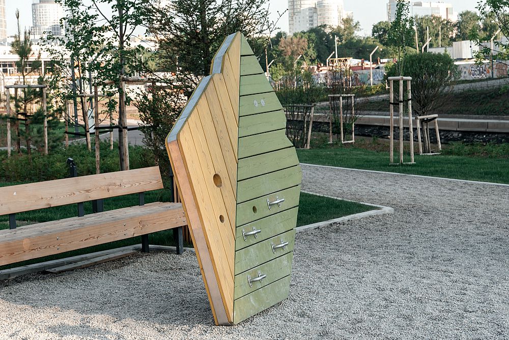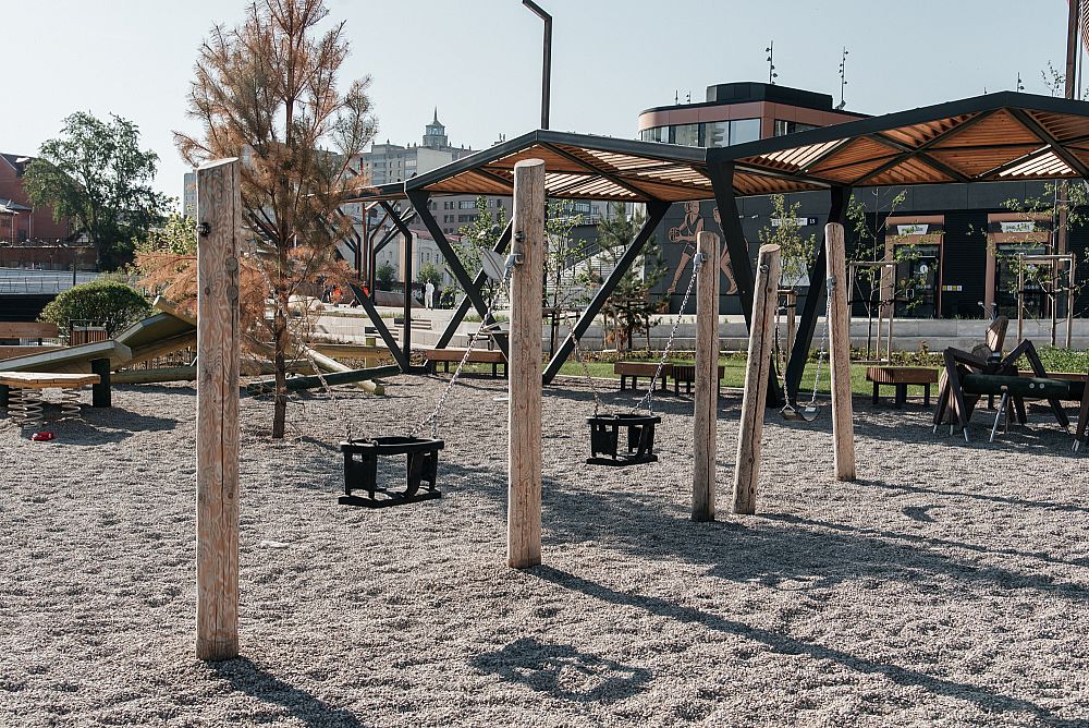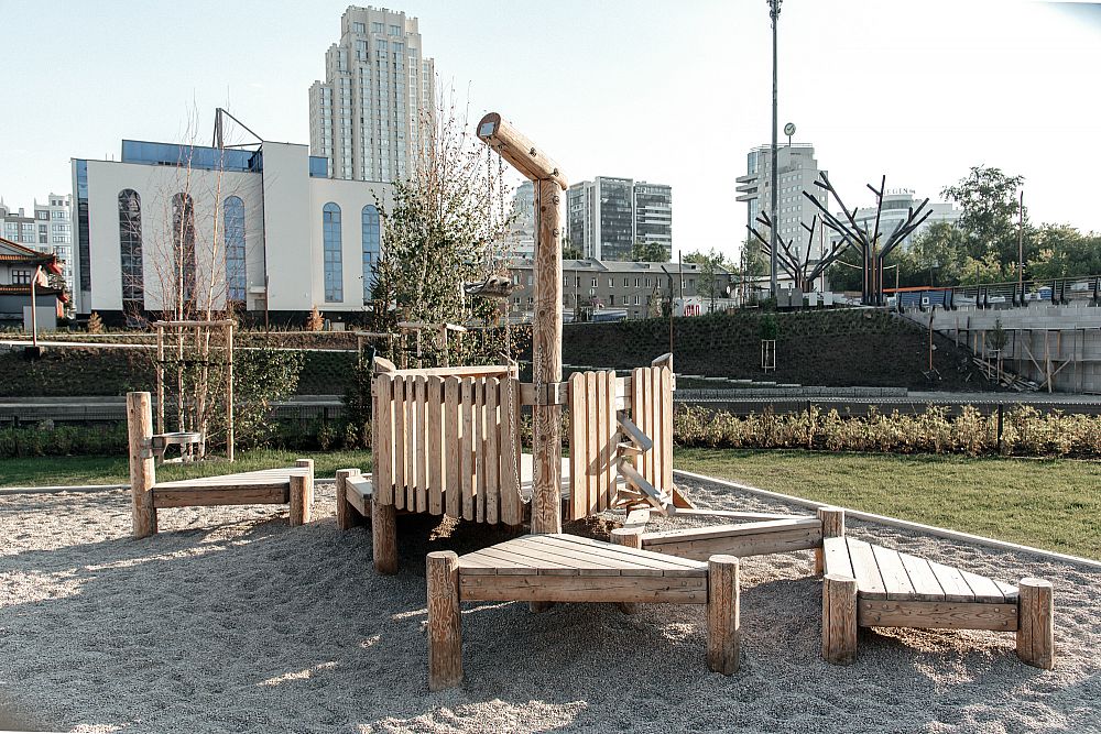 Интересный факт - это единственная площадка Тайги, где мы решили сыграть на контрасте и привлечь внимание к некоторым элементам. Получилось гармонично и главное, это центр притяжения для детей, ведь, гуляя по набережной, дети точно не пройдут мимо и задержатся надолго.