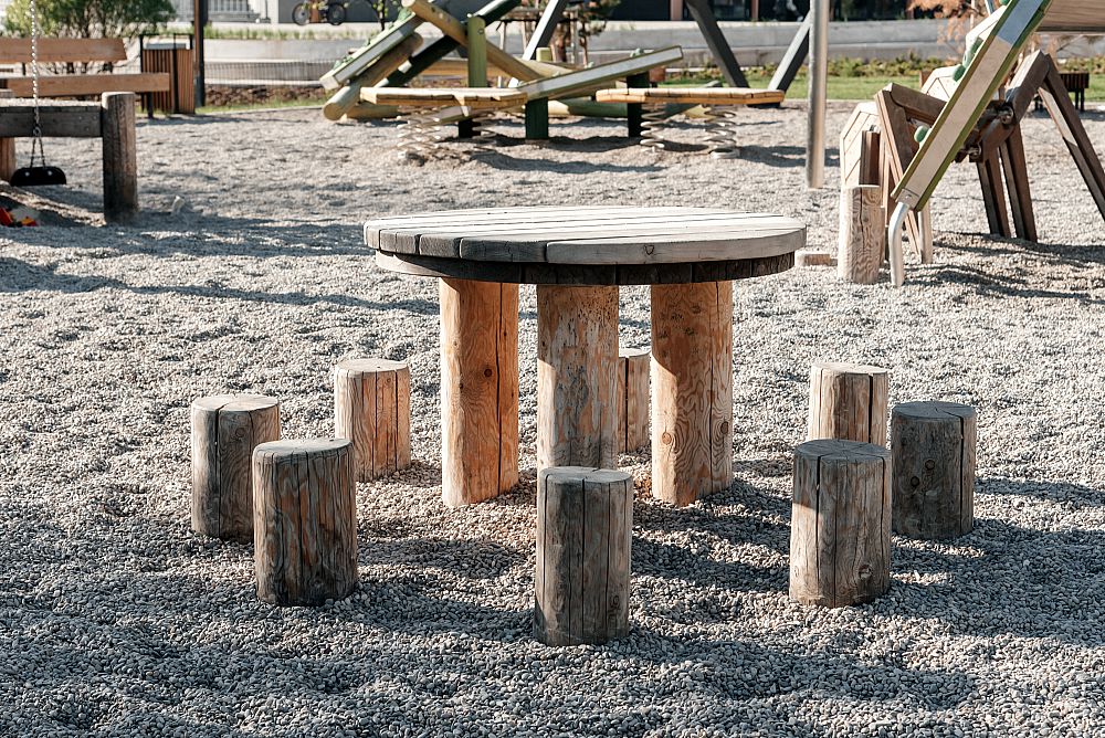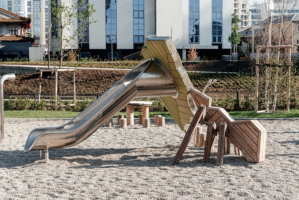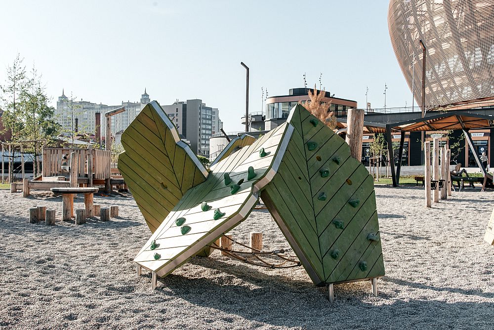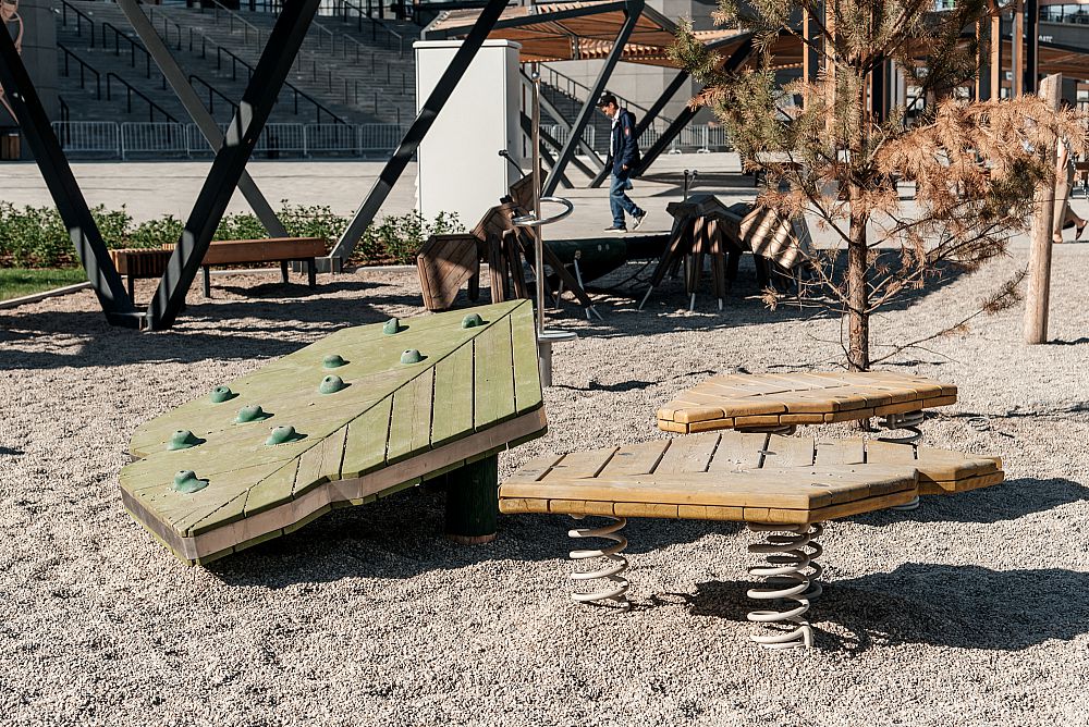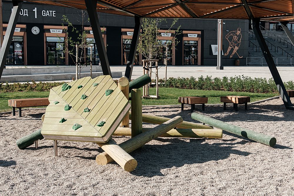 Также пространство дополнили изделия в лесной тематике - различные лазательные комплексы с горкой и скалолазными хватами, пружинки, зона для игр, где вместо песка - речная галька.