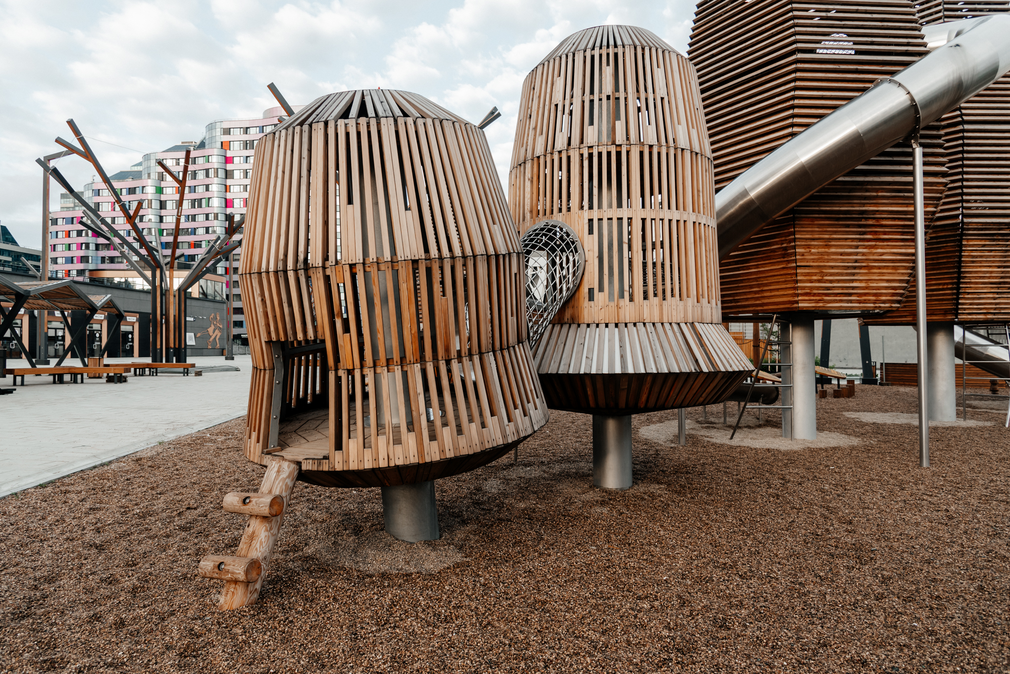 Наклон досок на башнях не случаен, издалека он формирует монолитный визуальный образ, при этом позволяет взрослым вблизи наблюдать за происходящим внутри корпусов деревьев, а также сохранять сухость пространства внутри при выпадении осадков.