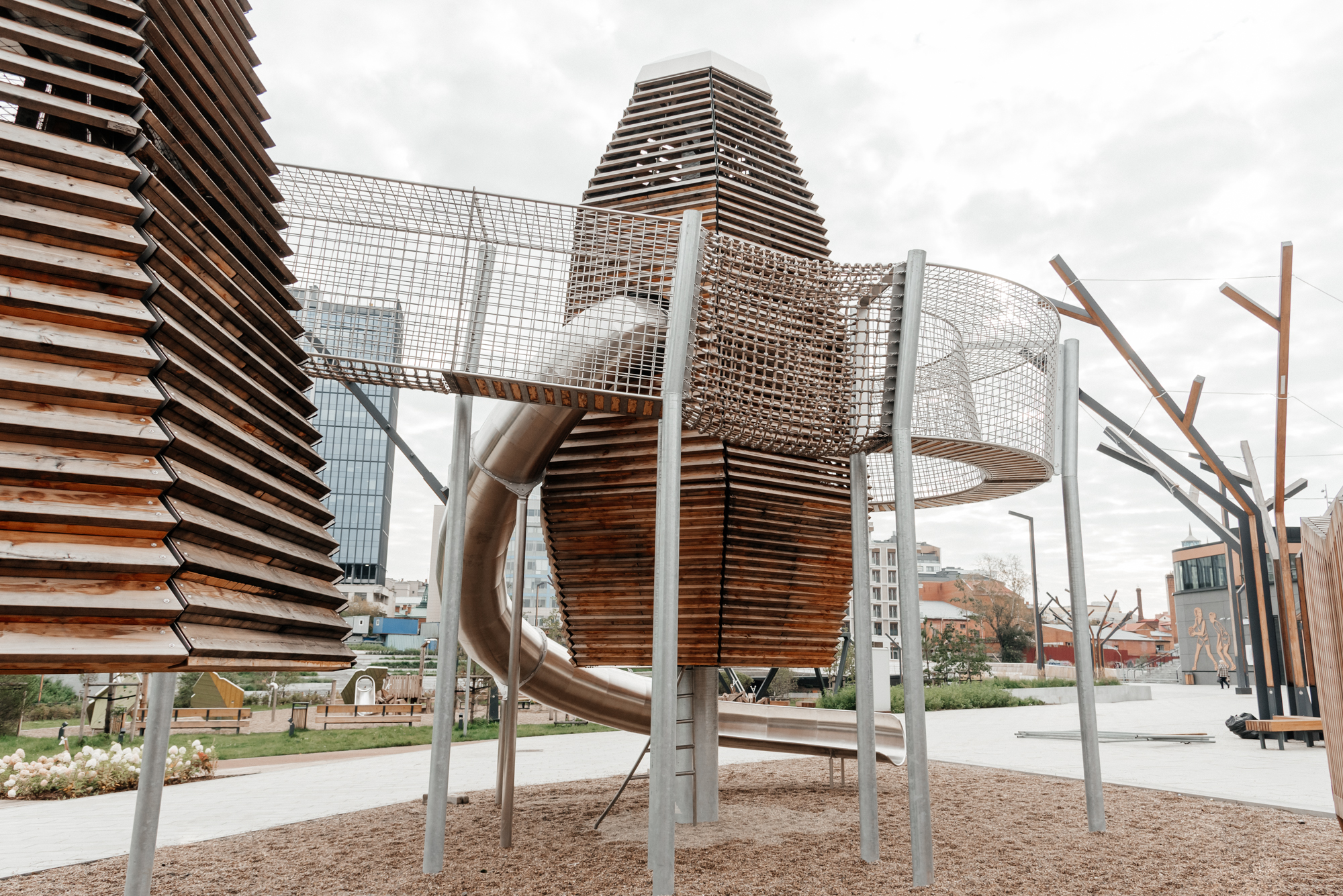 Мы вошли в проект благоустройства набережной реки Исеть в качестве экспертов по игровой среде по приглашению ландшафтного бюро S&P. За основу площадки была взята предложенная архитекторами идея «Уральского леса». Дальнейшая работа нашей команды превратила идею в полноценный проект с уникальной инженерией и продуманными сценариями игры. Появилось зонирование и взаимодействие между объектами, площадка стала живой, логичной и безопасной. Центральные фигуры пространства - башни в форме хвойного и лиственного дерева, символизируют смешанный уральский лес. Нам не хотелось создавать деревья одинаковыми фигурами. В итоге, с помощью использования неправильных шестиугольных сечений, удалось сохранить природную индивидуальность каждого дерева. Игровые деревья никогда не повторяются в своих очертаниях, собственно как и живые деревья в реальной жизни. Работа над конструкторской документацией, а также физическое создание и контрольные сборки деревьев на производстве стали настоящим инженерным испытанием, но именно так рождается подлинная индивидуальность.