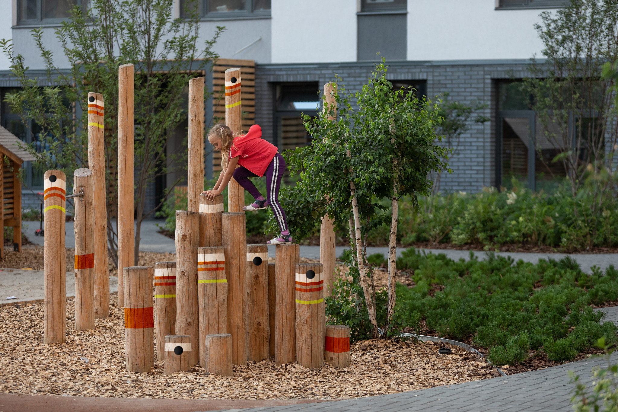 Мы воспринимаем наше оборудование как часть окружающего пространства, выстраиваем логические маршруты перемещения по площадке и игровые сценарии, обозначаем зоны спокойных и активных игр детей старших и младших возрастов, уделяем внимание ландшафту, озеленению и инфраструктуре.
