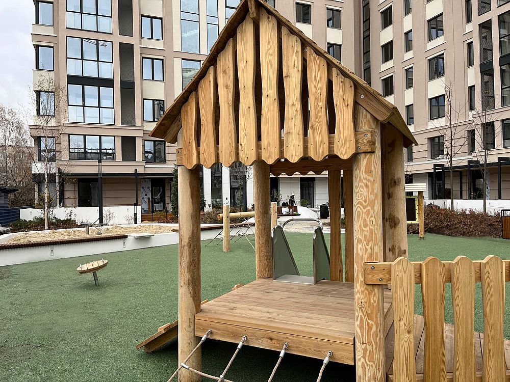 ЖК Александровский сад - пример качественной городской среды, где историческая застройка района сочетается с современным жильем бизнес класса. Основная идея благоустройства жилого комплекса – создание ощущения природного пейзажного парка. Данный эффект достигается путем формирования природного ландшафта и живописного озеленения. Игровое оборудование содержит комплекс для малышей, пружинные качалки и качель-гнездо.