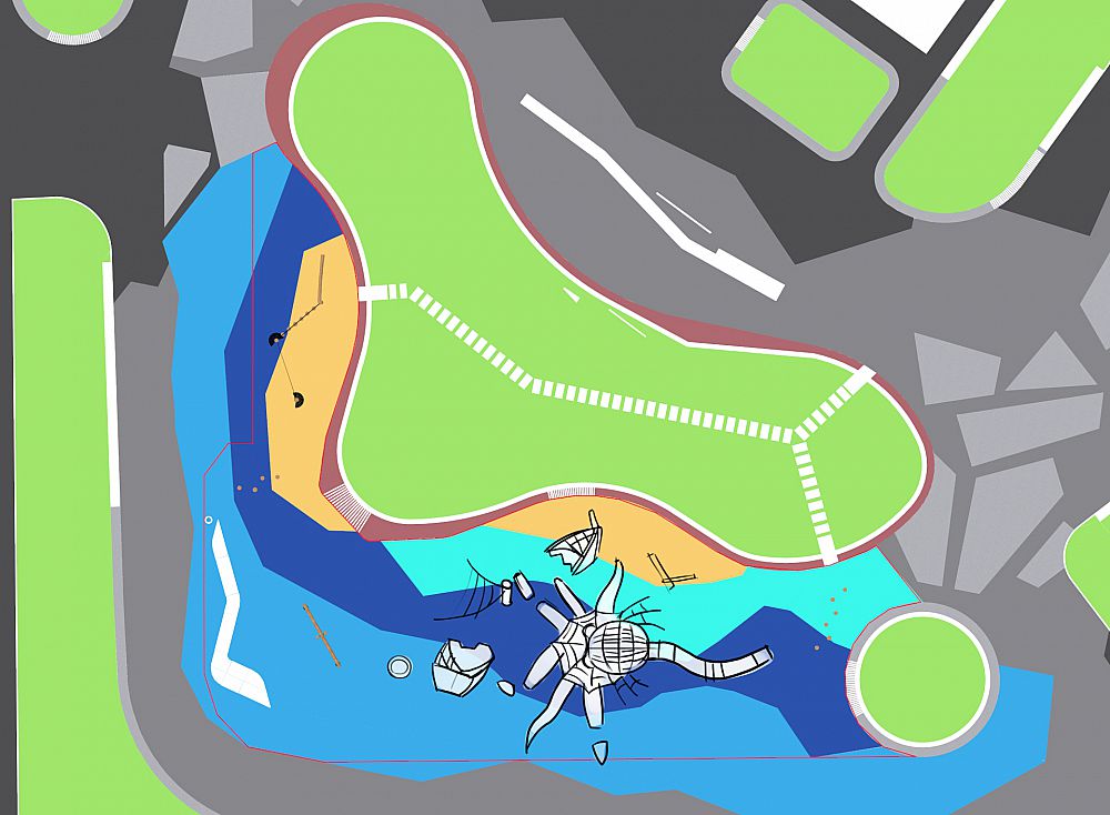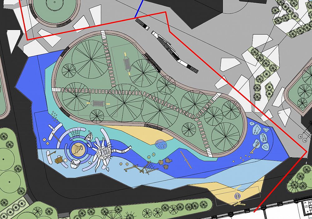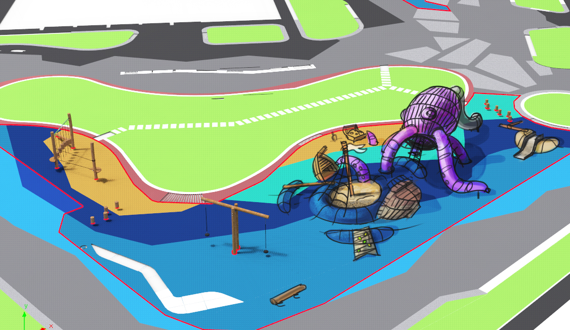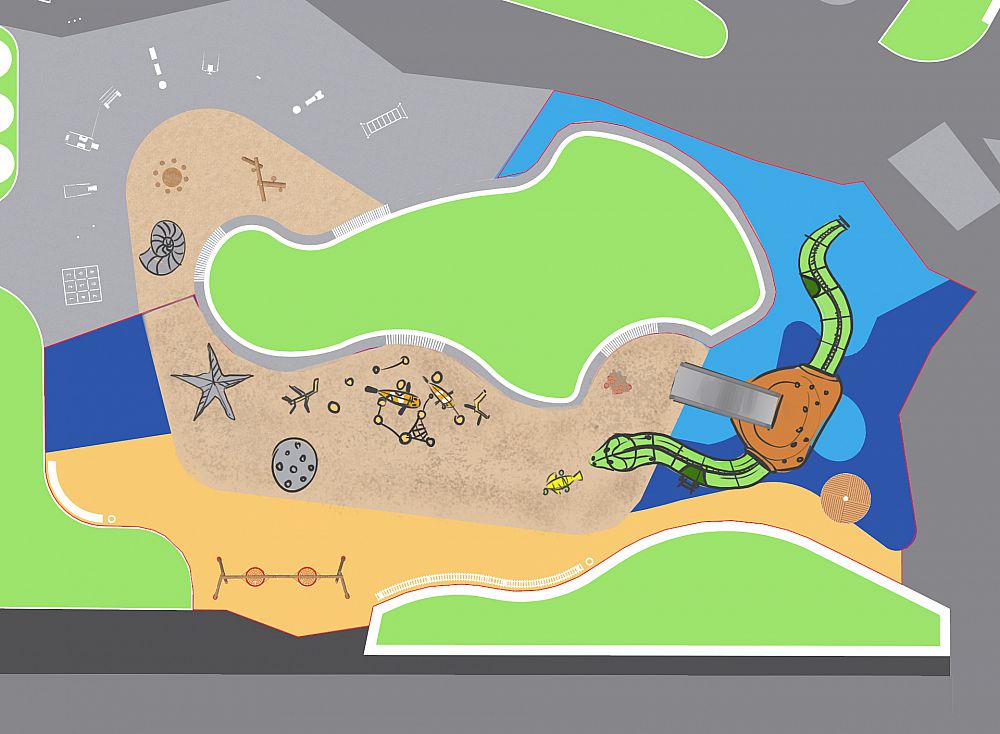Доминантой детской площадки стала история разрушения морским монстром корабля. Высокая конструкция осьминога приглянется детям постарше, которым интересно испытать ощущение высоты и быстрого спуска. Круги на воде от затопления корабля образовали на площадке радиальные узоры геопластики, которые служат элементами для развития навыков балансирования, и одновременно холмами для размещения игровых элементов для совсем маленьких детей.