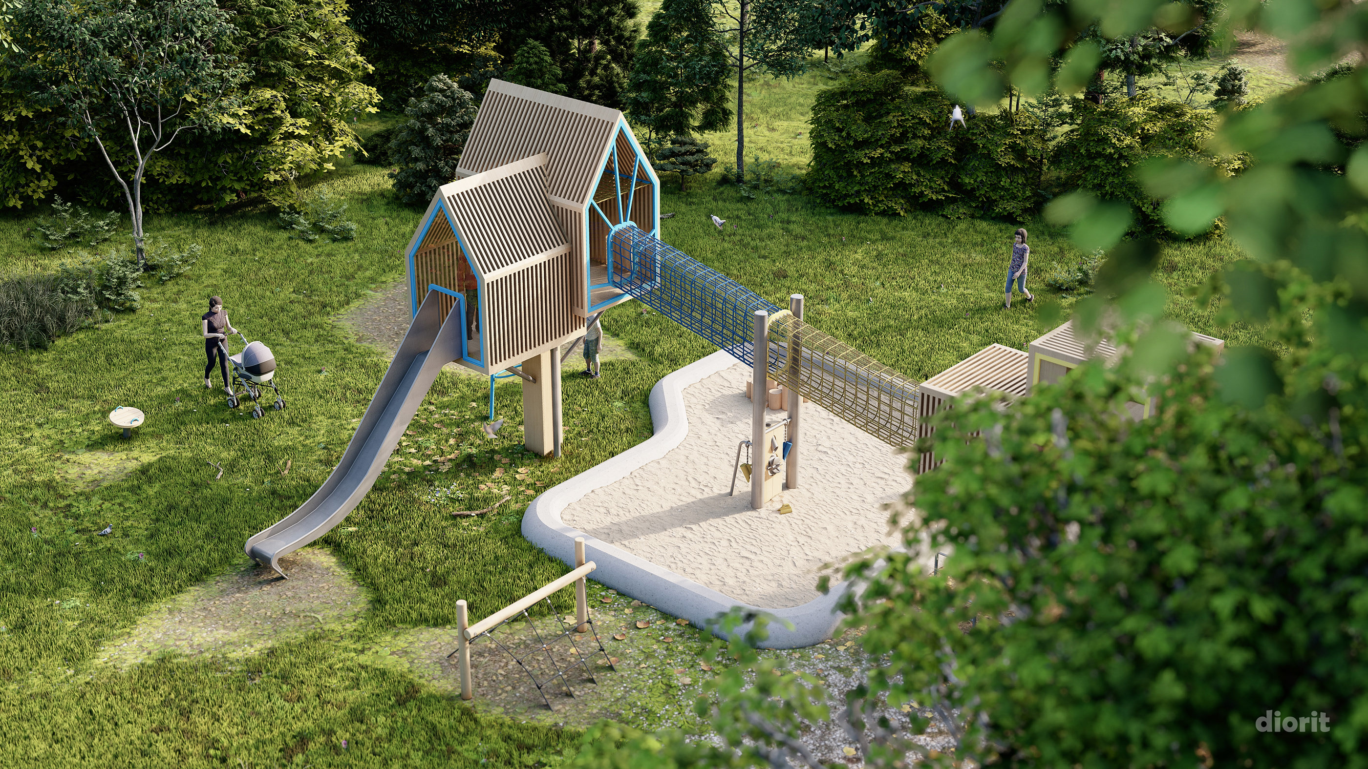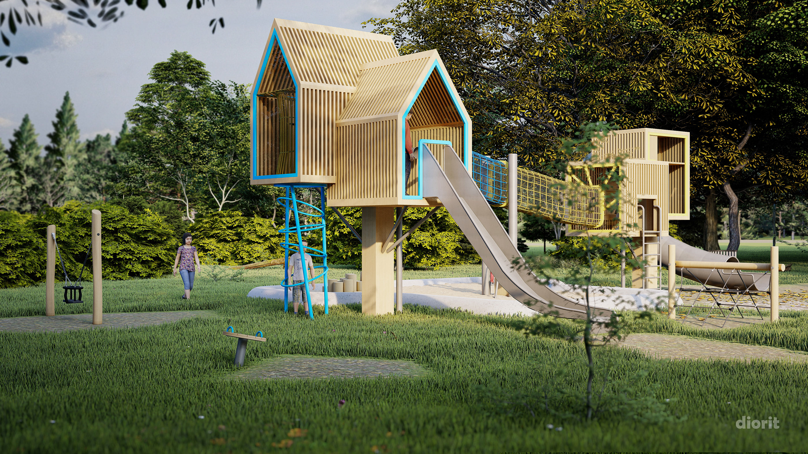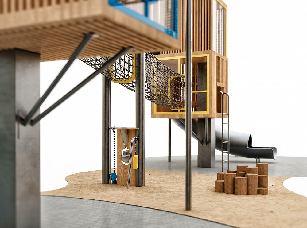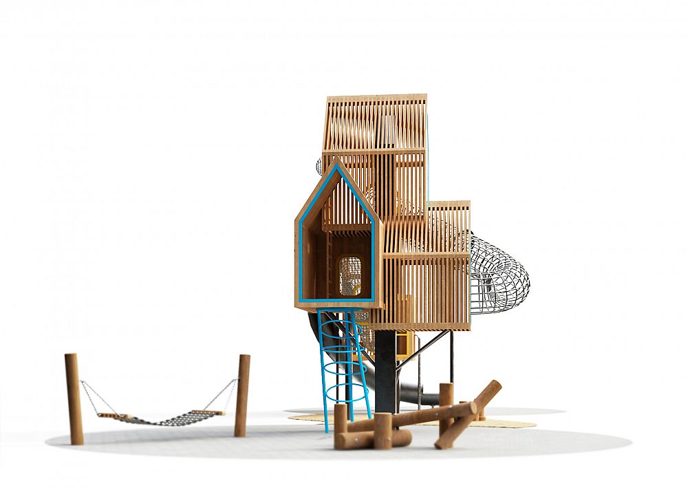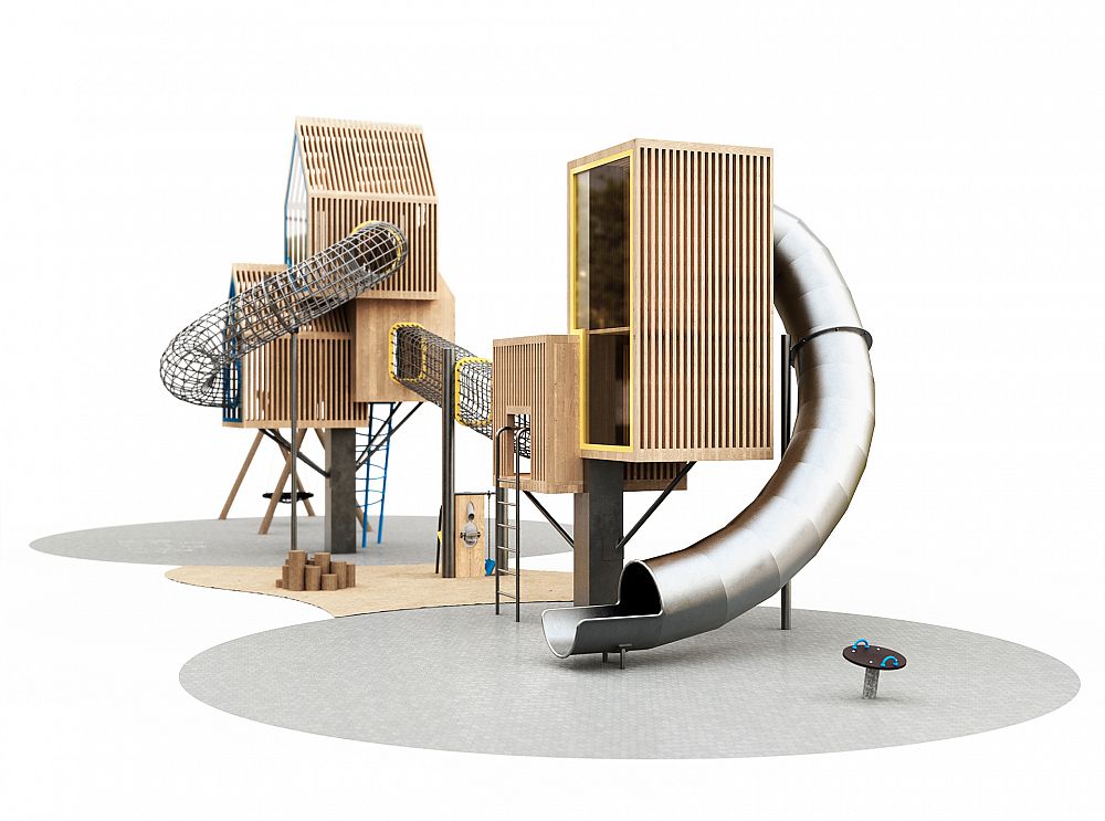 Проект PlayHouses разработанный для ЖК Первомайская 60, г. Екатеринбург. Когда на детскую площадку отводится не очень много квадратных метров можно применить приём наращивания конструкции вверх, чтобы раскрыть потенциал игрового поля. В данном случае перед нашей командой как раз стояла такая задача. Нужно было поднять игровой комплекс вверх и максимально задействовать нижнюю часть под игровое оборудование: качели, карусель, песочницу. Свободное пространство при этом так же должно присутствовать - слишком плотное расположение оборудования считается дурным тоном в дизайне игровых площадок. Плюс ко всему, нужно учитывать зоны безопасности и зоны приземления детского оборудования, но это уже из разряда "а разве можно их не учитывать?" - Без них никуда.