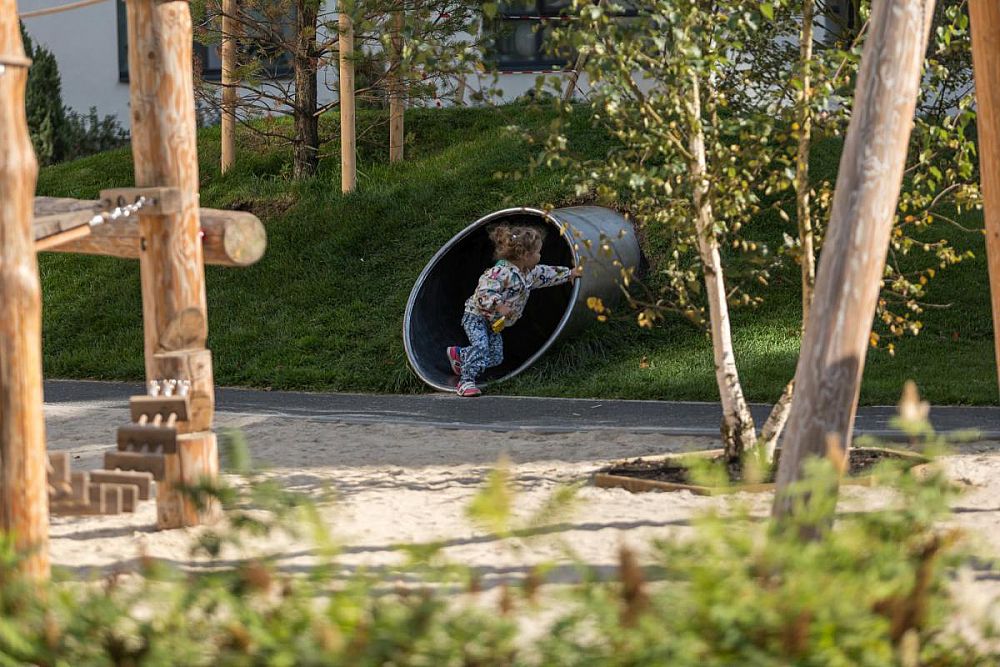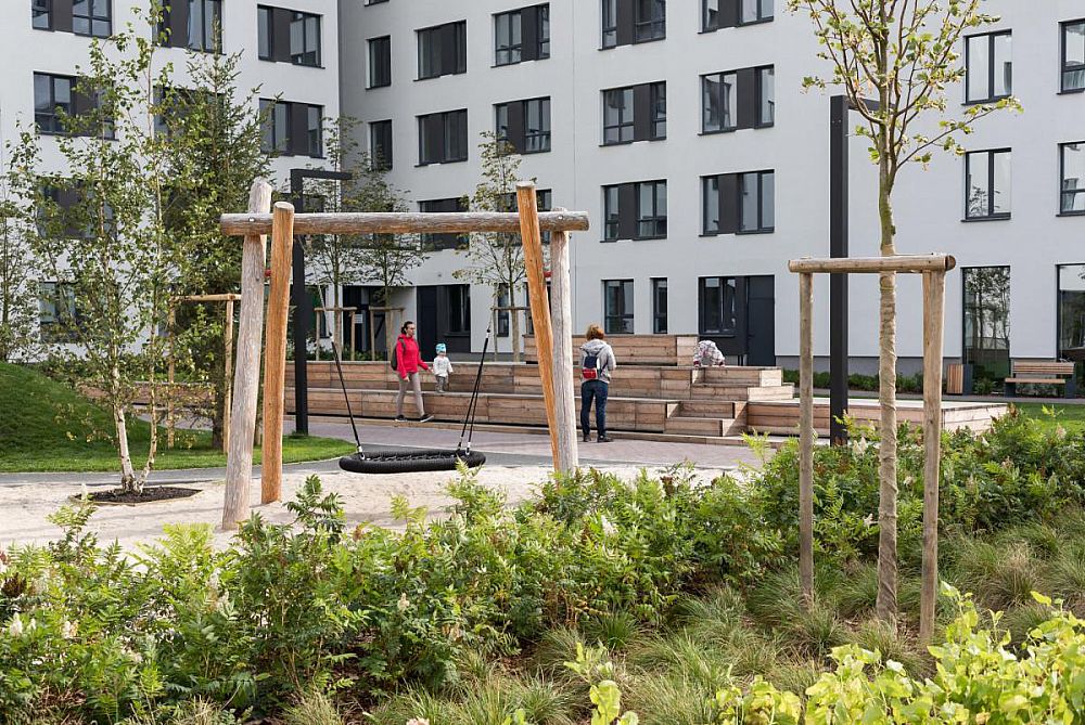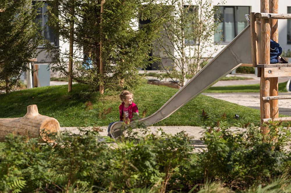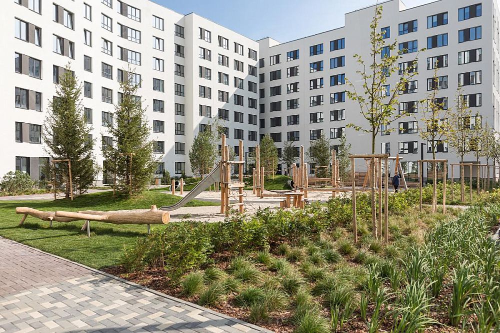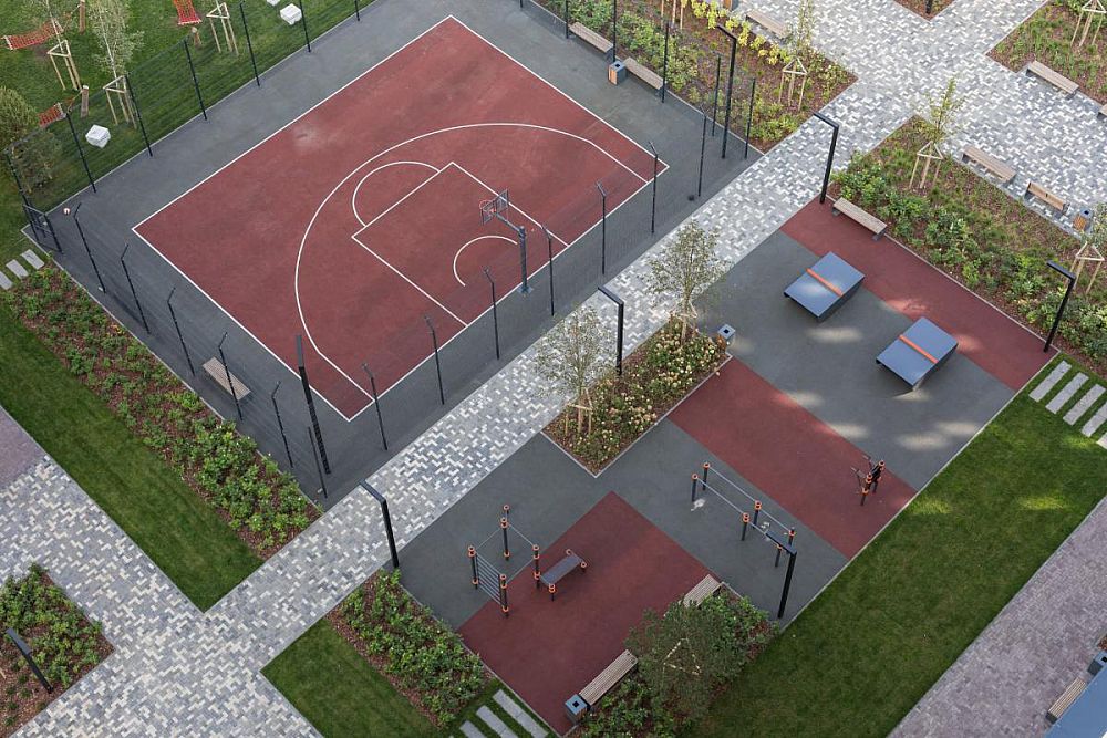 Большой закрытый двор с шикарным озеленением и большим количеством игровых и спортивных активностей. Двор расположен в новом районе «Солнечный». Во дворе использованы как стандартные изделия линейки Тайга так и реализованы индивидуальные решения архитекторов в виде многоуровневого настила-скамьи. Помимо игрового оборудования двор оснащен спортивным воркаут-оборудованием, теннисными столами, баскетбольными стойками.