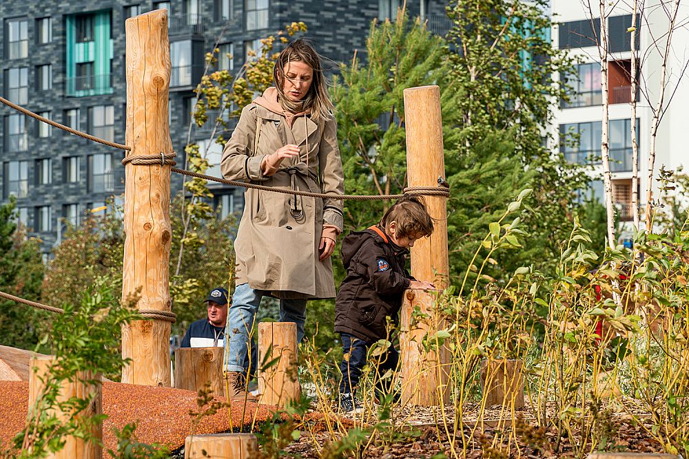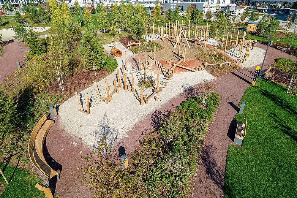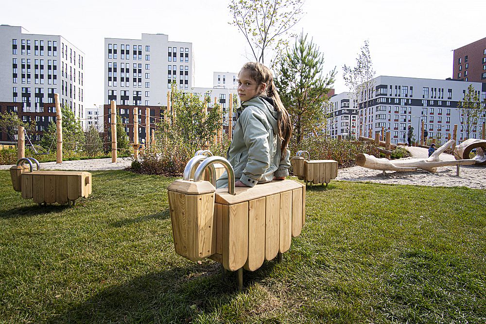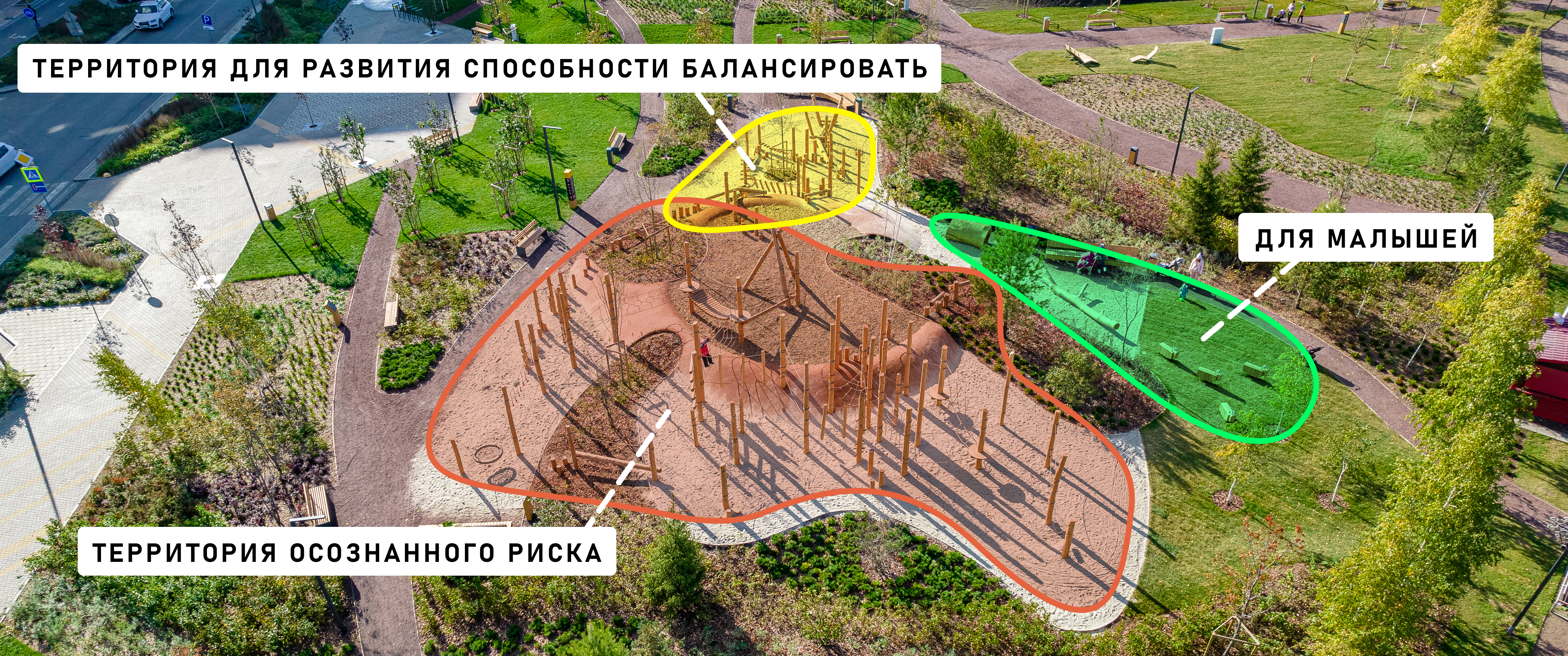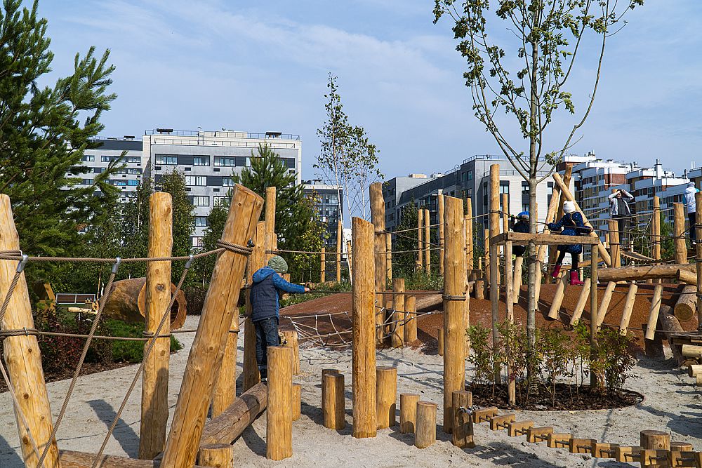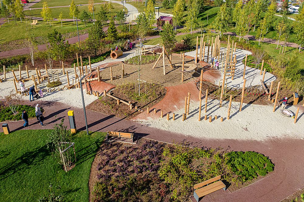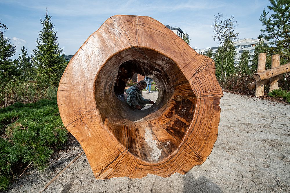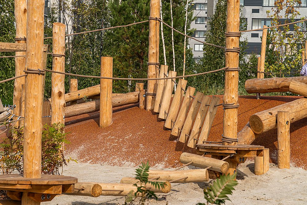 Нестандартный опыт работы с нелинейным пространством. Нашей задачей в проекте было создать игровое природное пространство на холме с большим перепадом высот (2 метра), которое бы удовлетворяло тематическим запросам заказчика. Площадка включает в себя три игровые зоны, разделенные по возрастам и функционалу: территория управляемого риска (лазательные элементы для детей 5-12 лет), зона для развития способности балансировать (лазательные конструкции для малышей 1-5 лет), а также лужайка для спокойного отдыха с отдельностоящими скамьями-барашками и примыкающая к лужайке песочная зона с корягами и тоннелем из цельного ствола дуба диаметром 1200 мм.