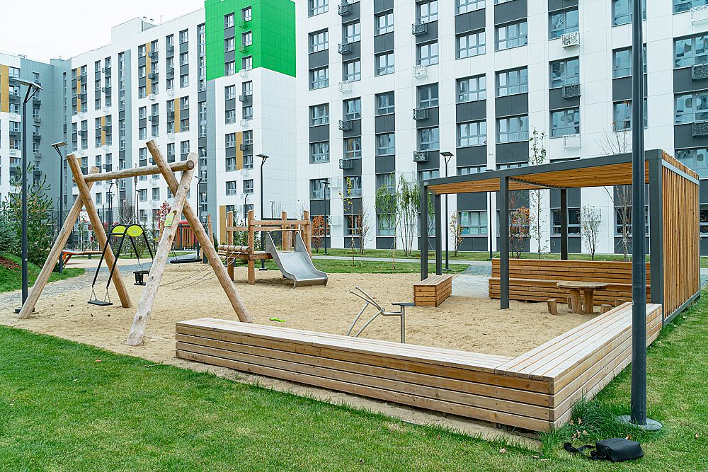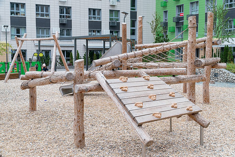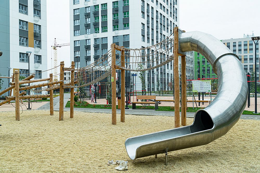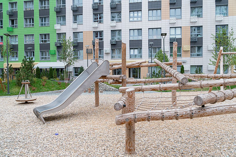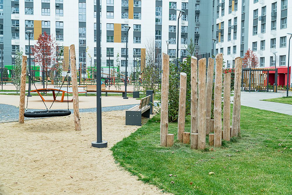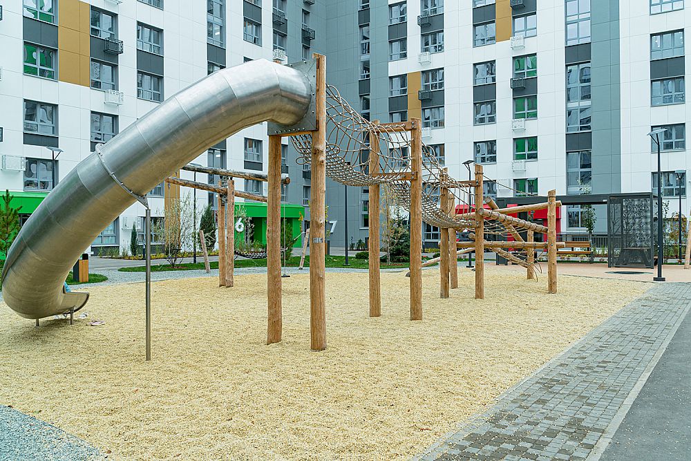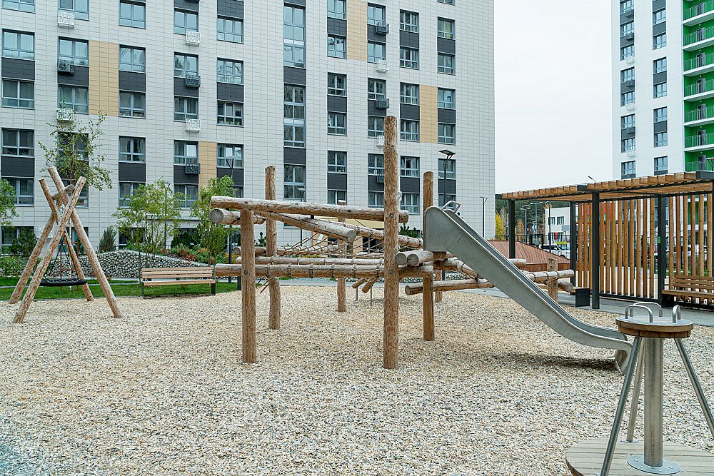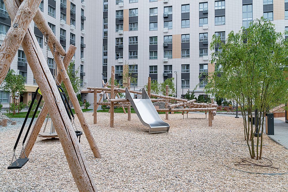 Реализация первой очереди строительства жилого комплекса. Объект является хорошим примером правильного подбора игрового оборудования и ландшафтного дизайна для получения синергетического эффекта в благоустройстве придомовых территорий.